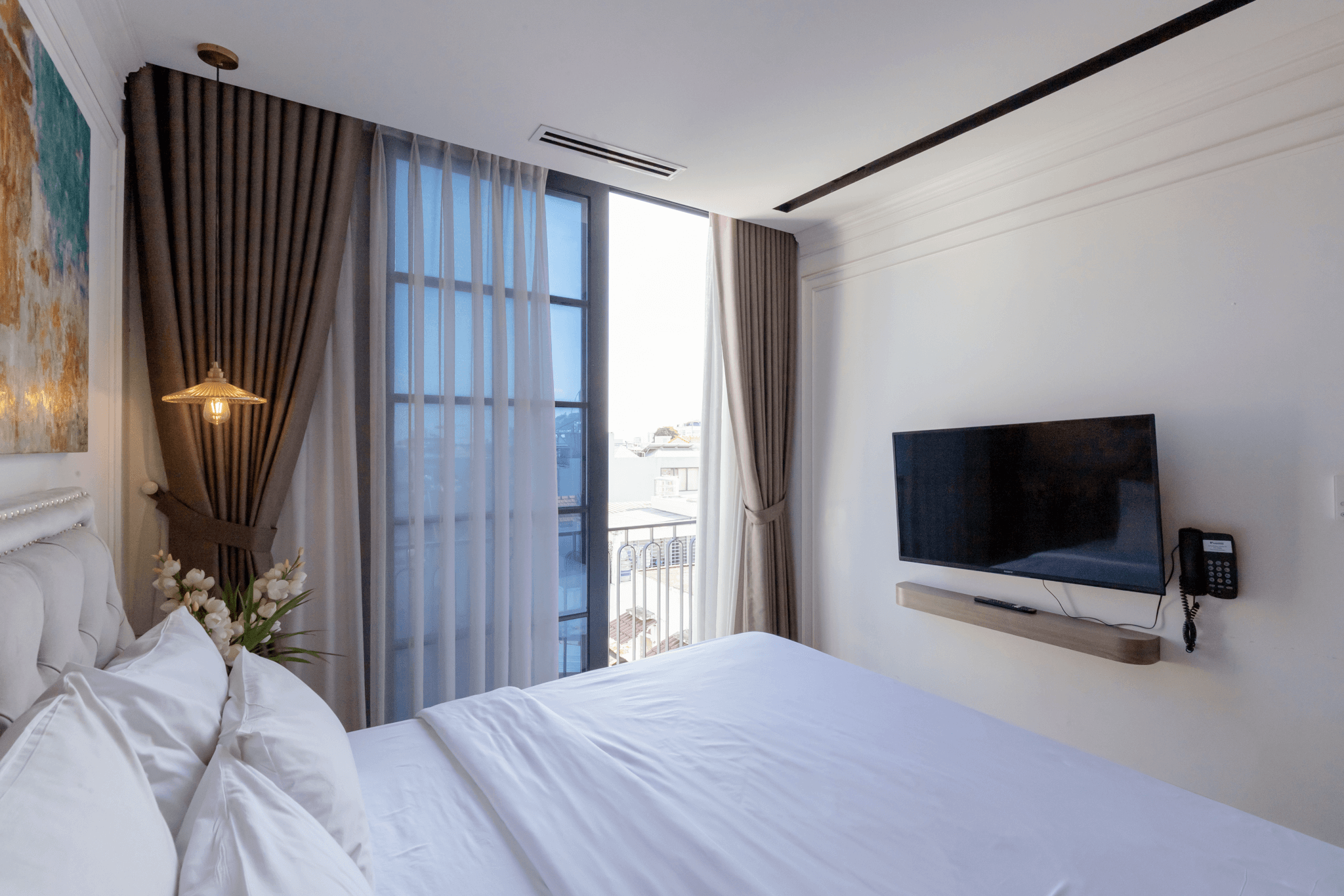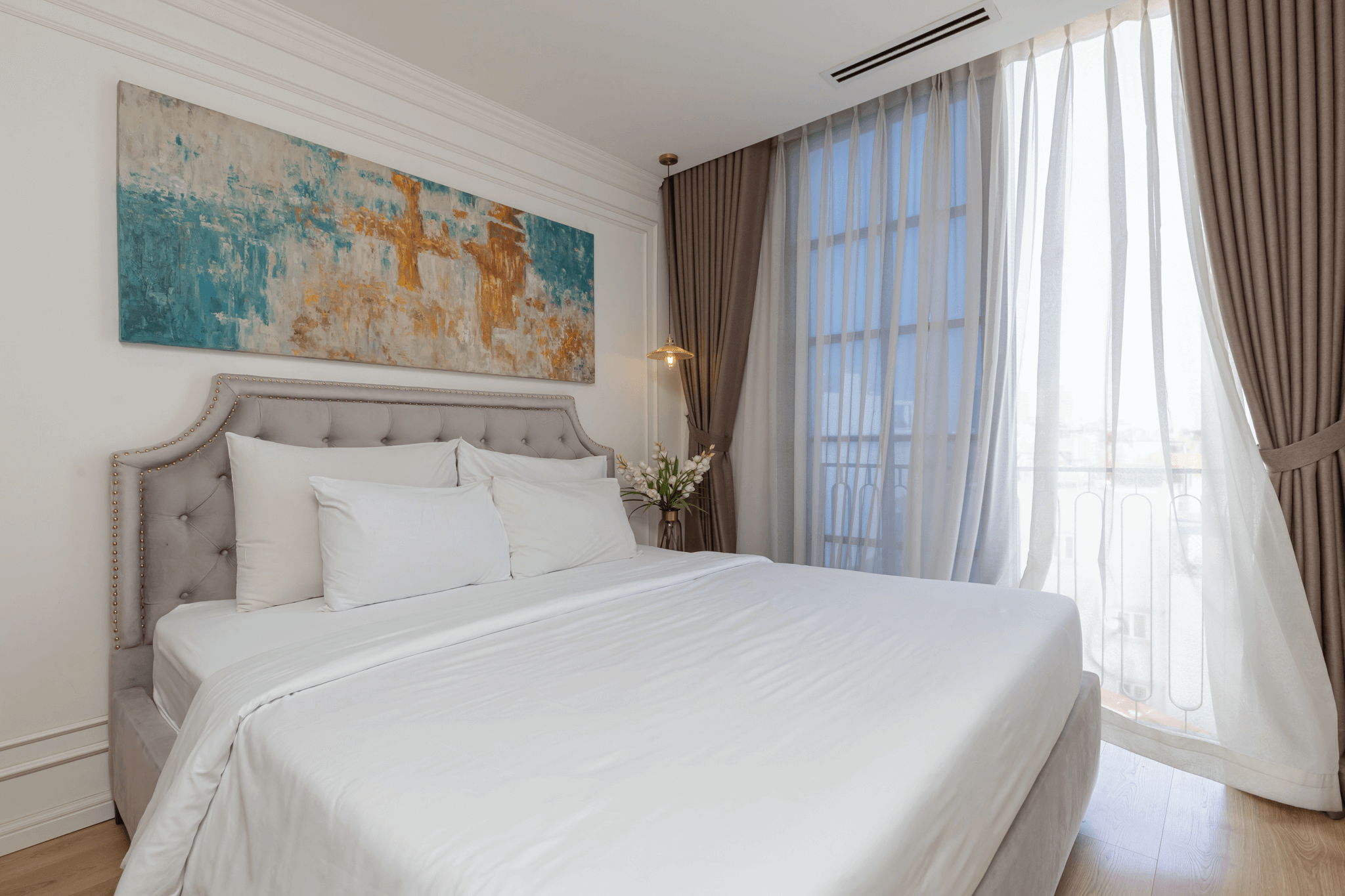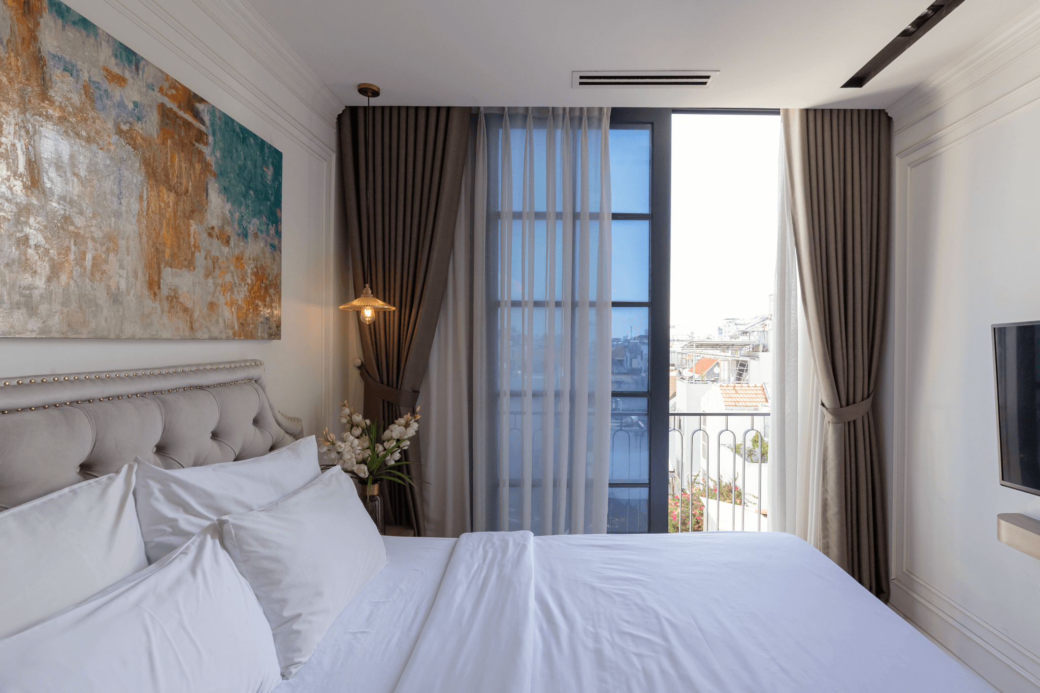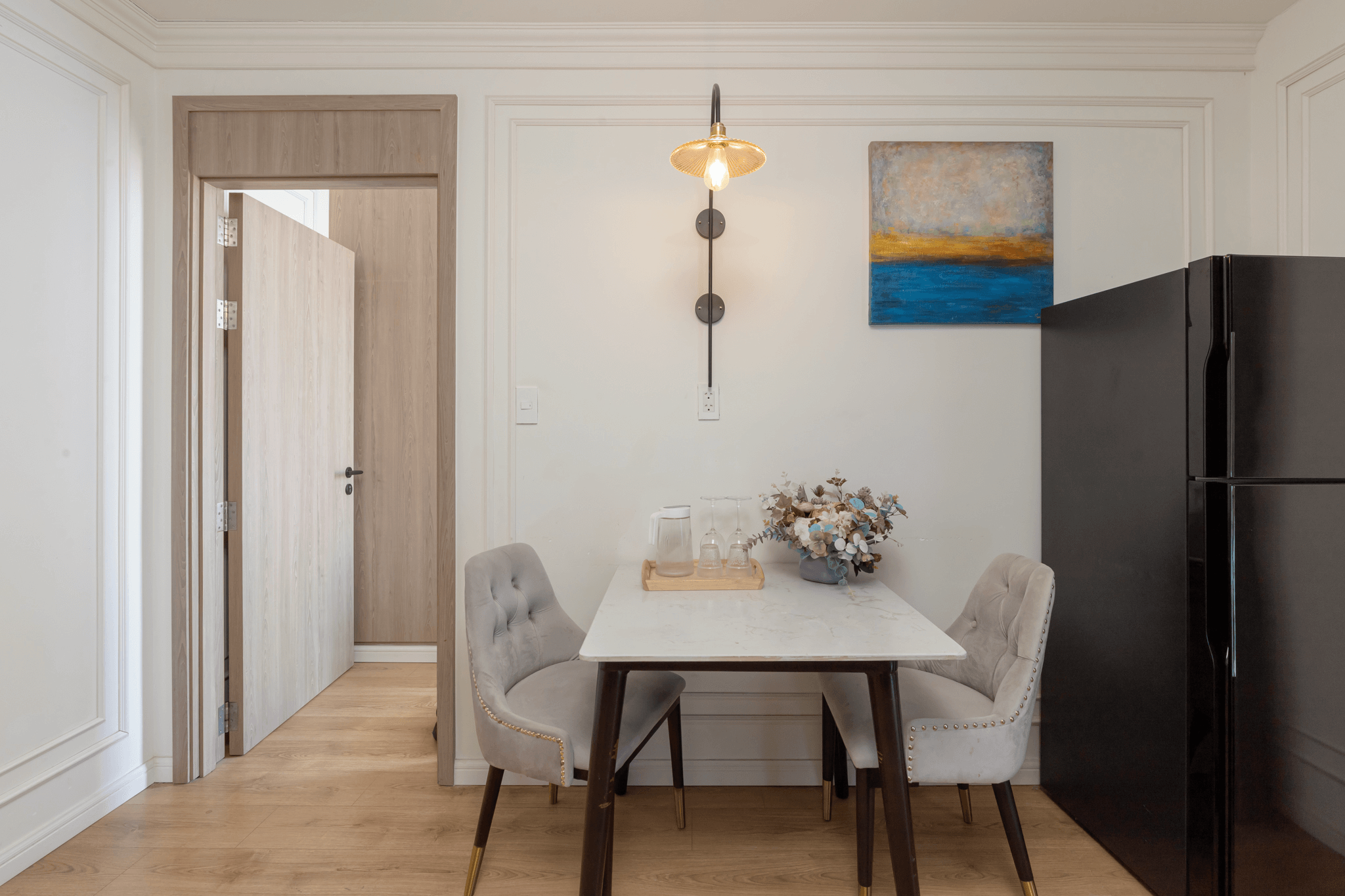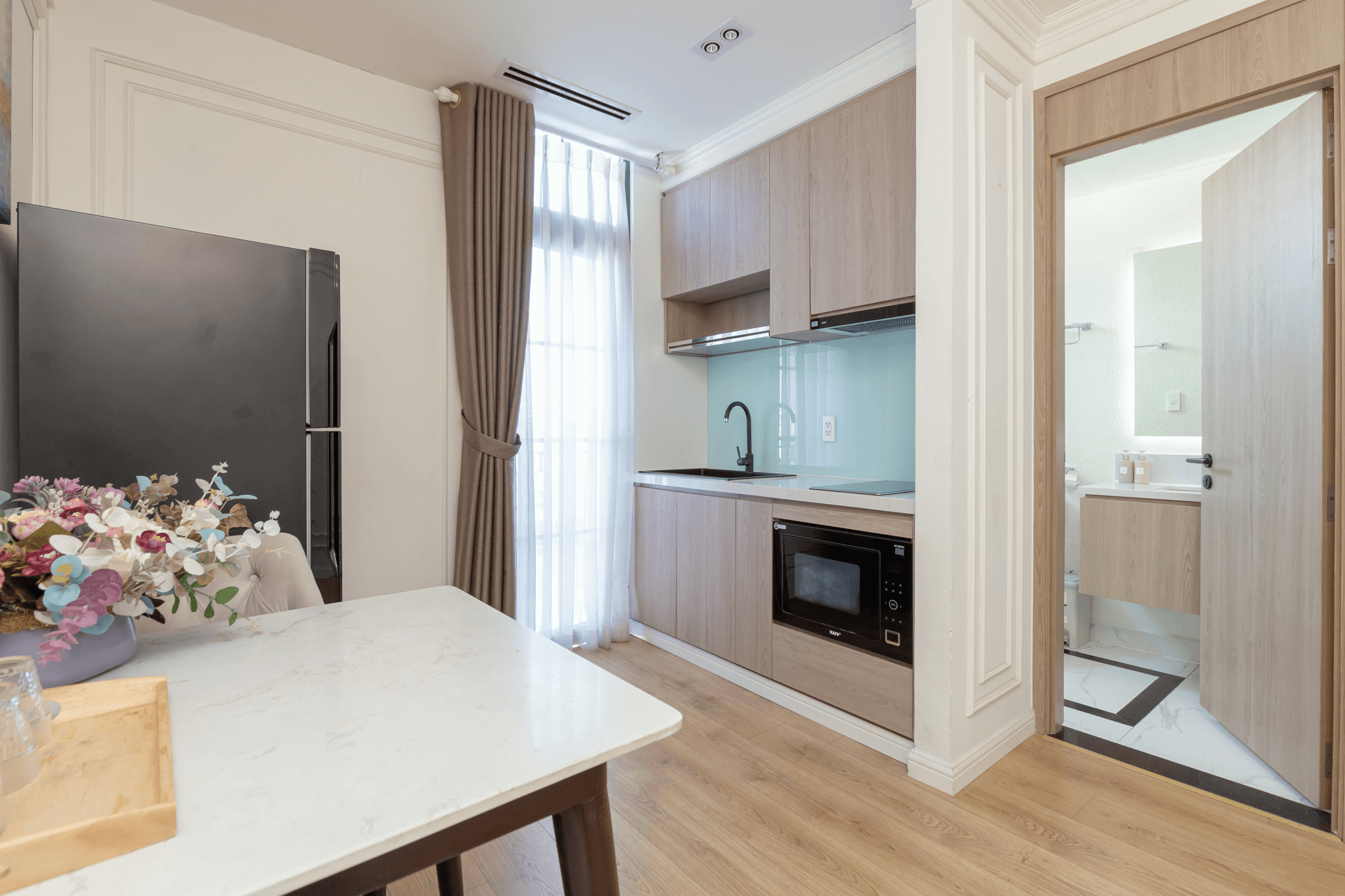 Không gian bếp riêng và phòng tắm khép kín với bồn tắm giúp bạn thư giãn trọn vẹn sau một ngày làm việc hay khám phá thành phố. Từ căn hộ, tầm nhìn hướng phố mở ra nhịp sống đô thị hiện đại nhưng vẫn đủ yên tĩnh để nghỉ ngơi.