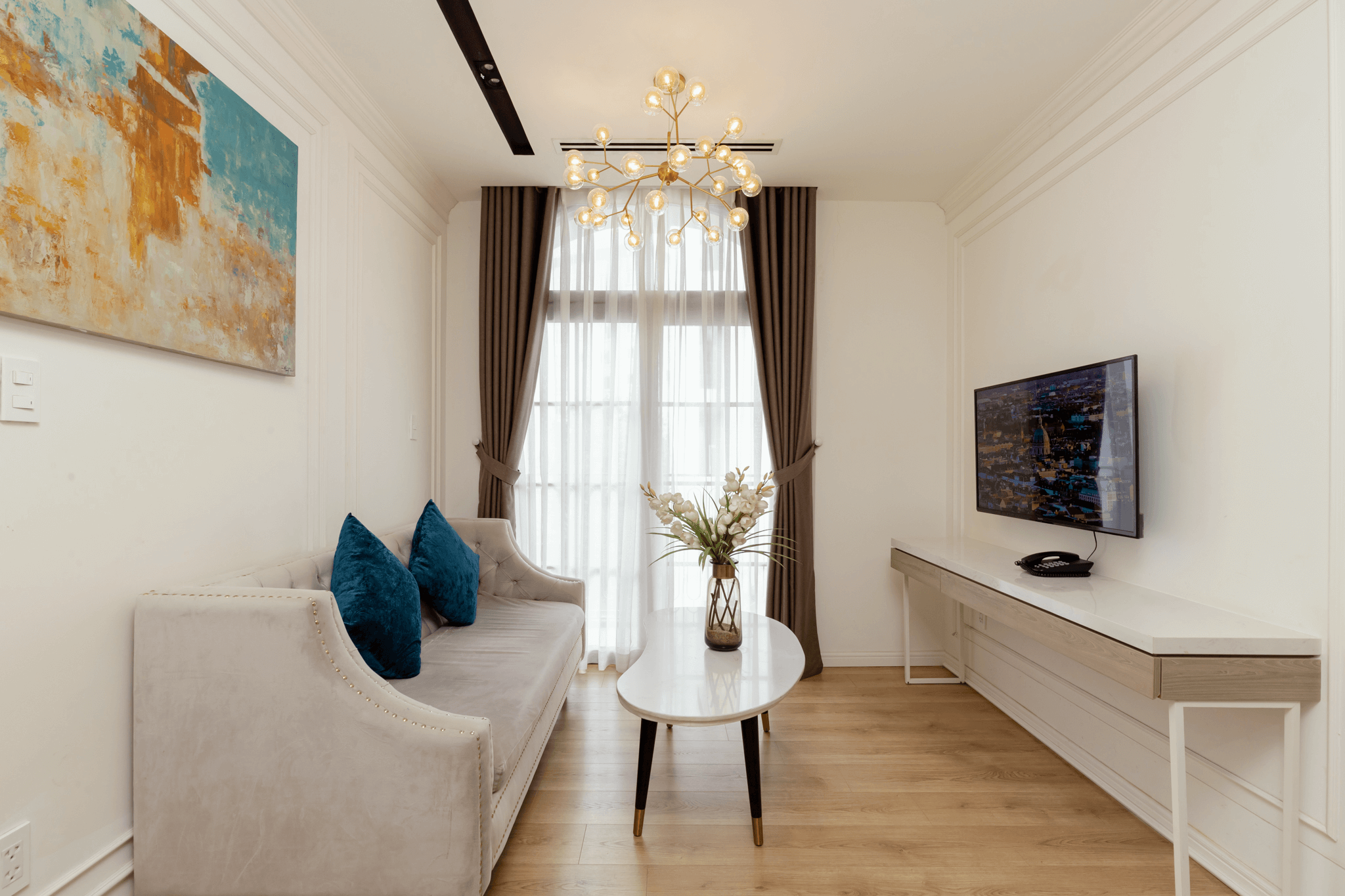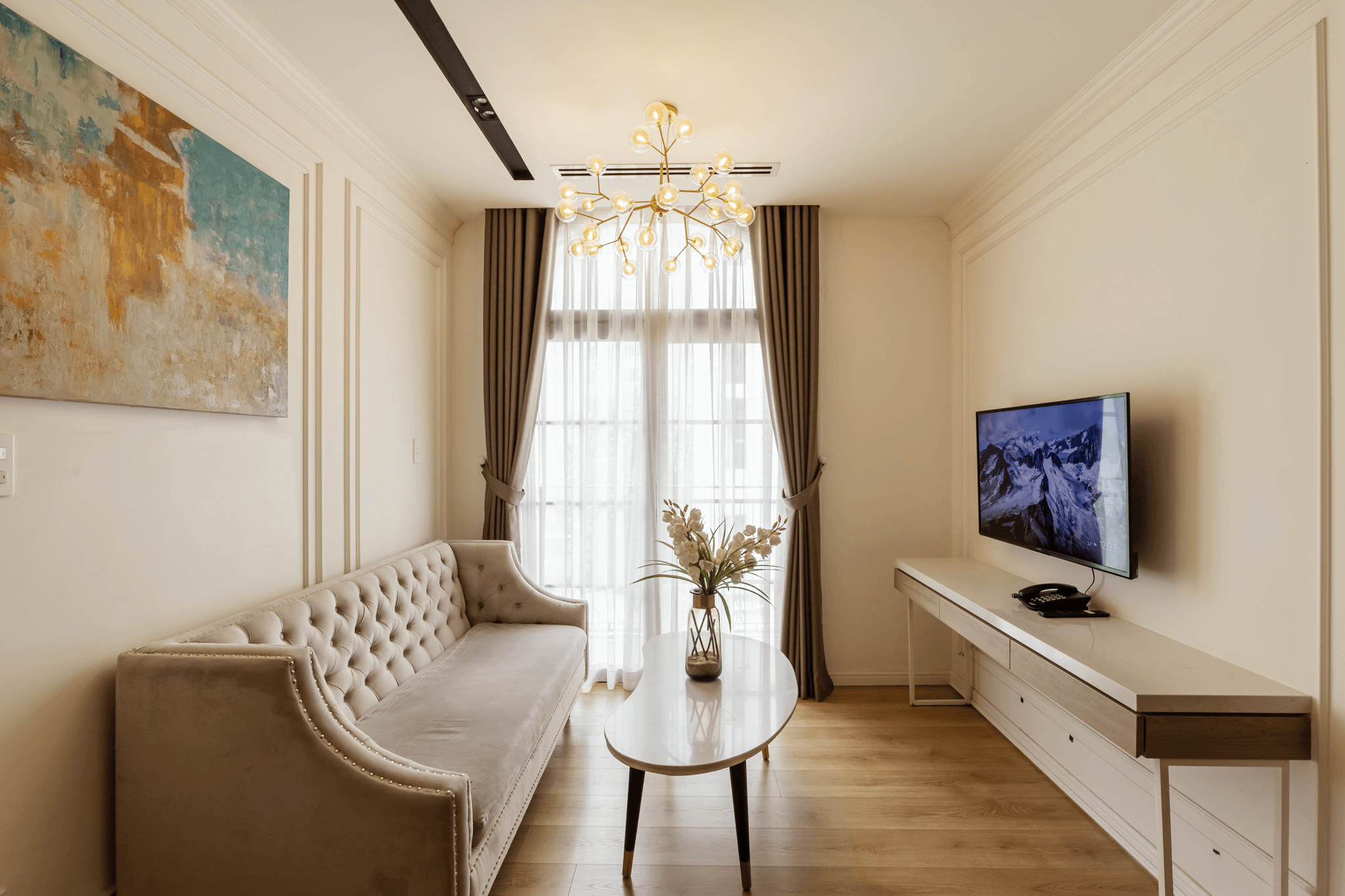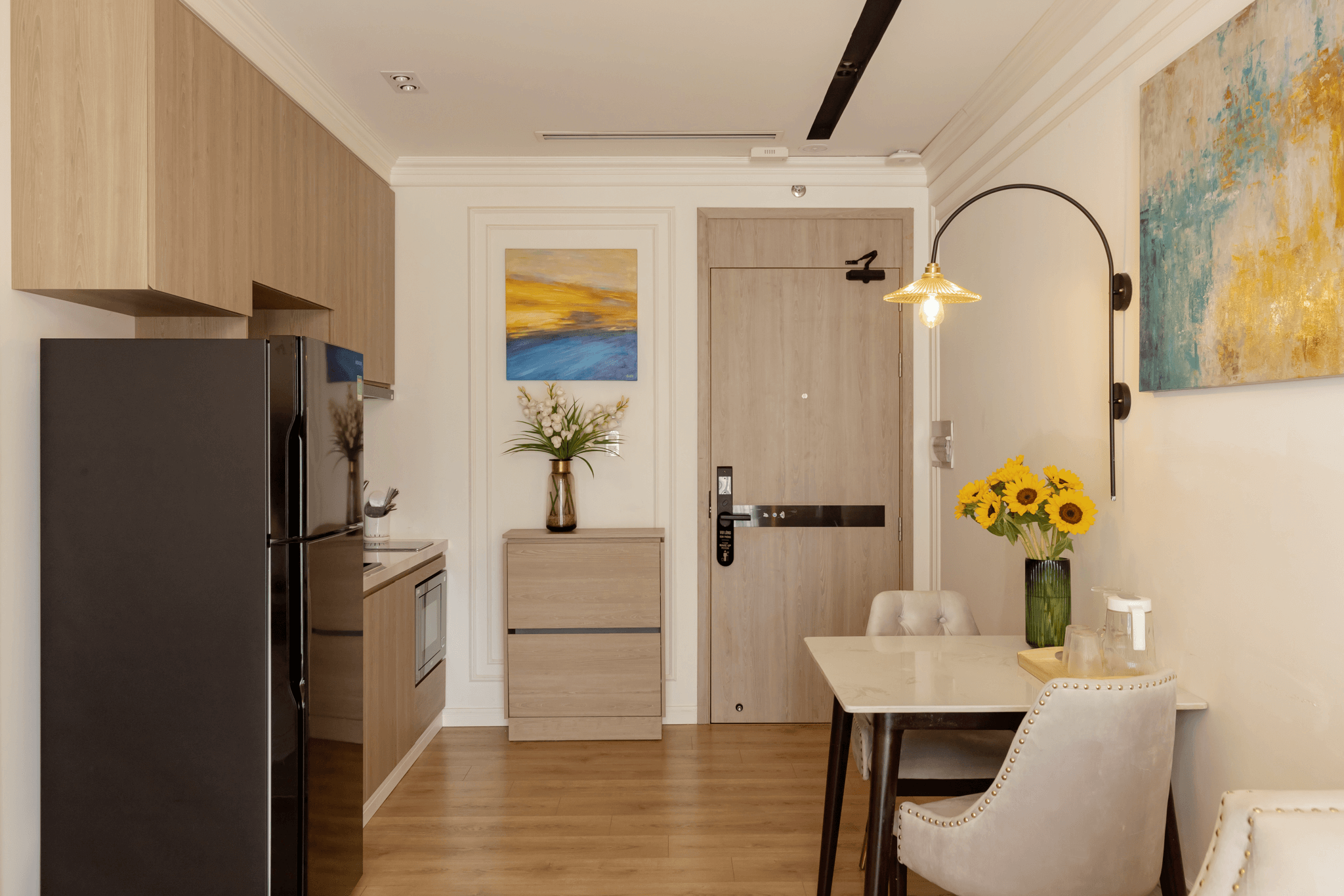 Superior 1 Bedroom có khu vực riêng biệt, tách không gian nghỉ ngơi và sinh hoạt chung. Phòng phù hợp cho khách lưu trú dài hạn, người đi làm hoặc cặp đôi cần sự riêng tư. Trang bị đầy đủ bếp, sofa, bàn ăn và phòng tắm riêng, mang lại cảm giác tiện nghi như tại ngôi nhà của bạn.