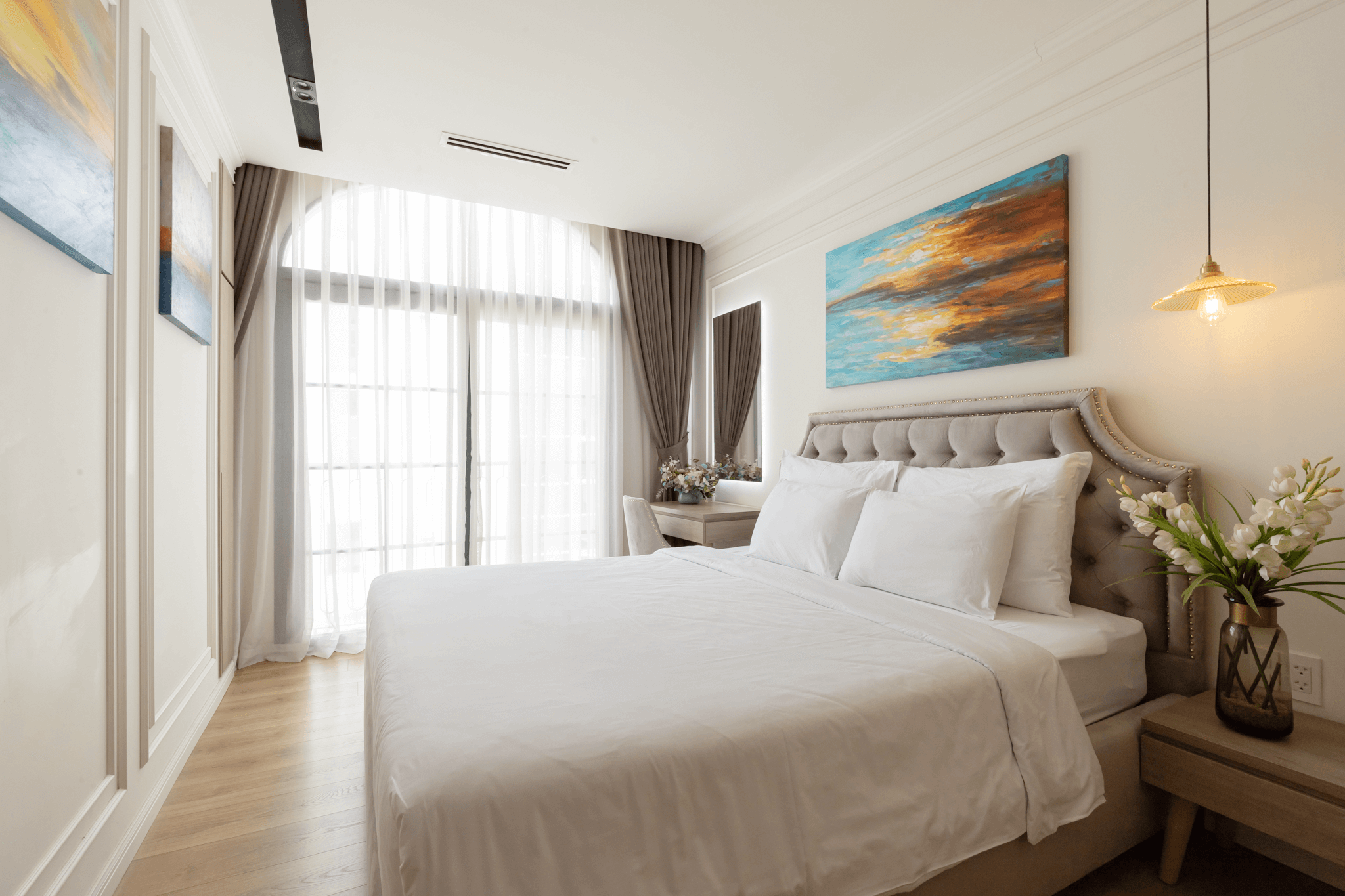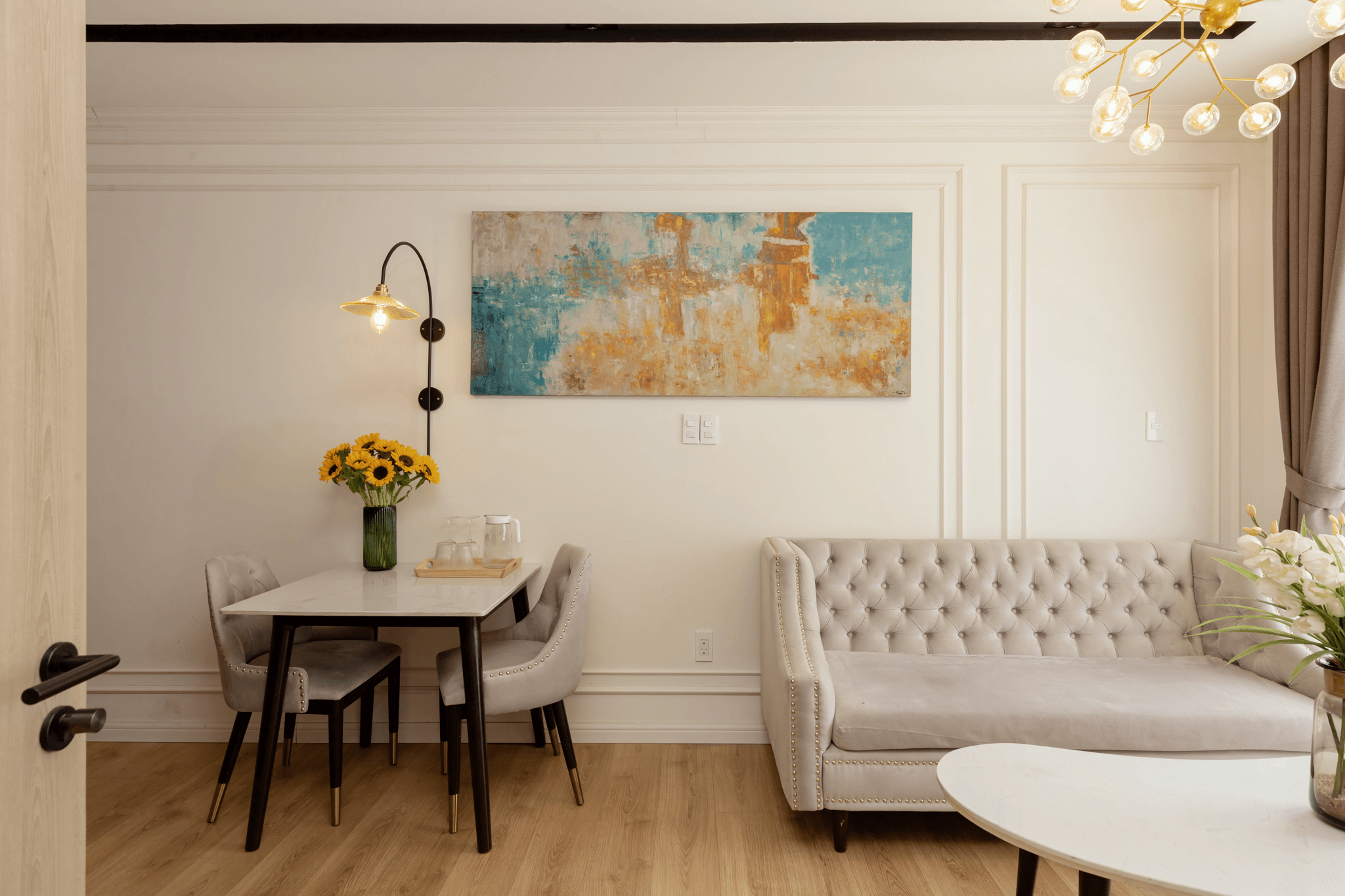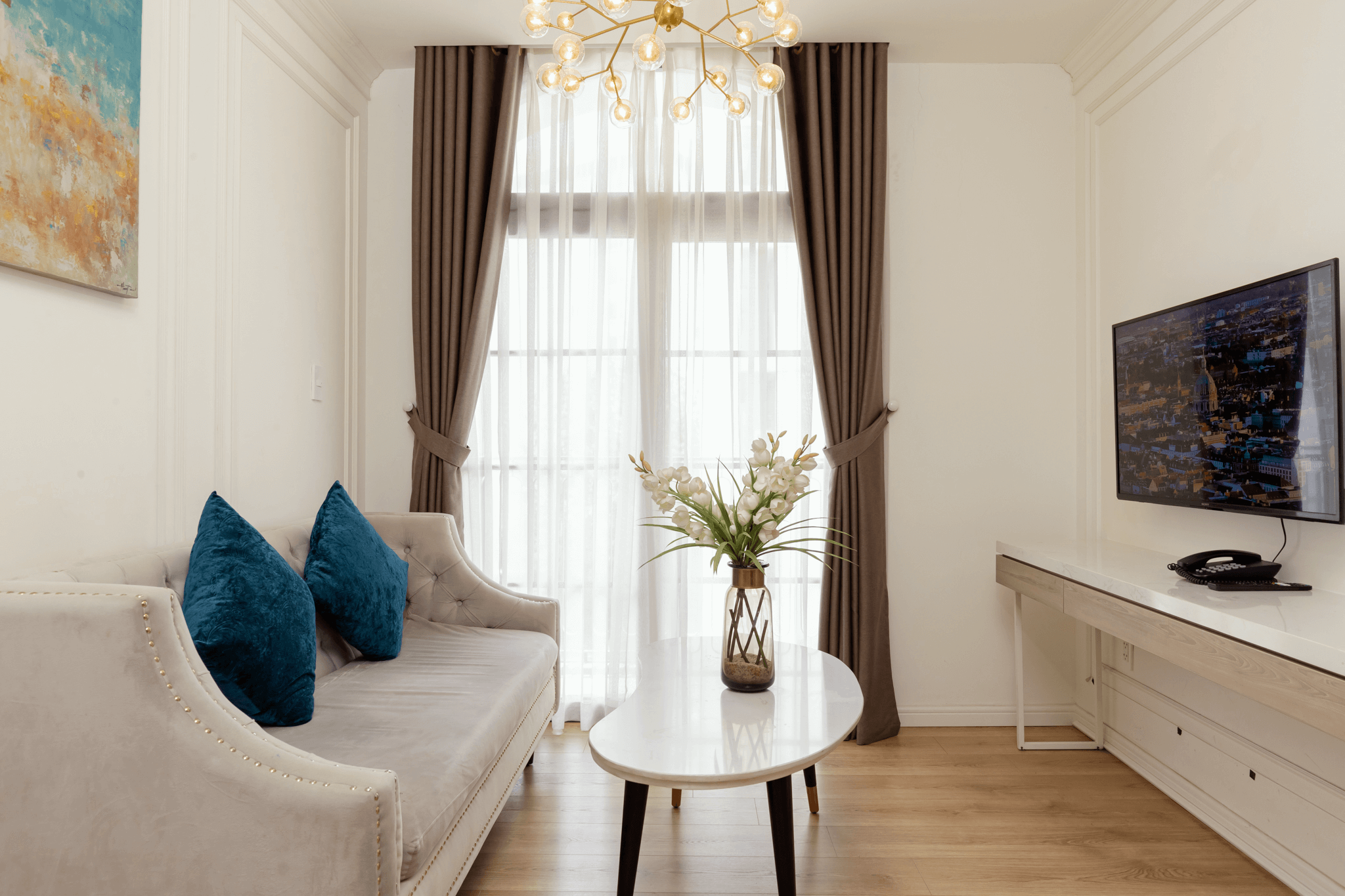 Superior 1 Bedroom có khu vực riêng biệt, tách không gian nghỉ ngơi và sinh hoạt chung. Phòng phù hợp cho khách lưu trú dài hạn, người đi làm hoặc cặp đôi cần sự riêng tư. Trang bị đầy đủ bếp, sofa, bàn ăn và phòng tắm riêng, mang lại cảm giác tiện nghi như tại ngôi nhà của bạn.